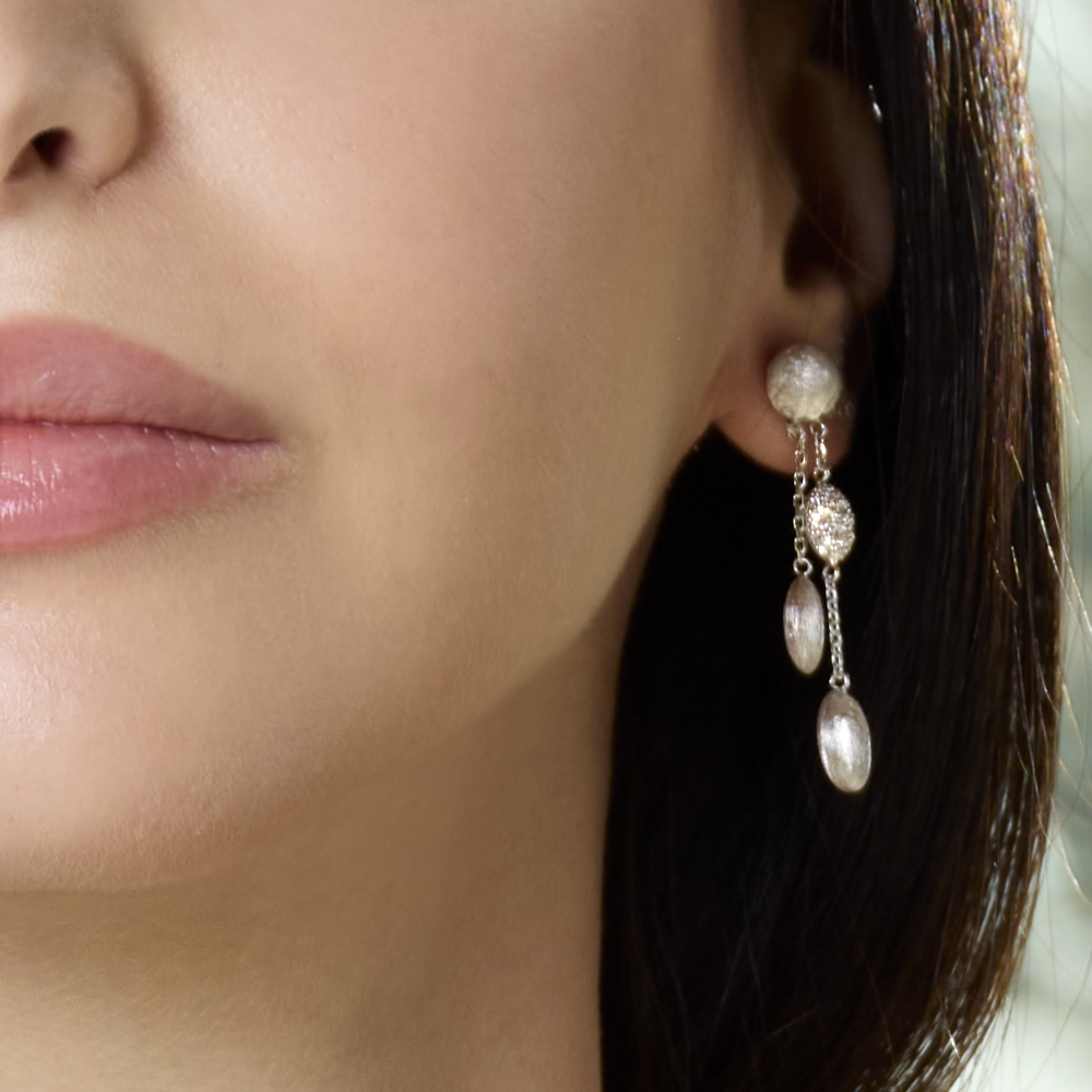 Ovali di diverse dimensioni si rincorrono in una composizione leggera e armoniosa, dove l’oro bianco 18 kt satinato incontra il bagliore dei diamanti. Il pavé trasforma la luce in movimento.